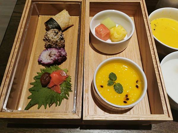 中式附的是粥 小菜 壽司 蒸鱈魚 水果